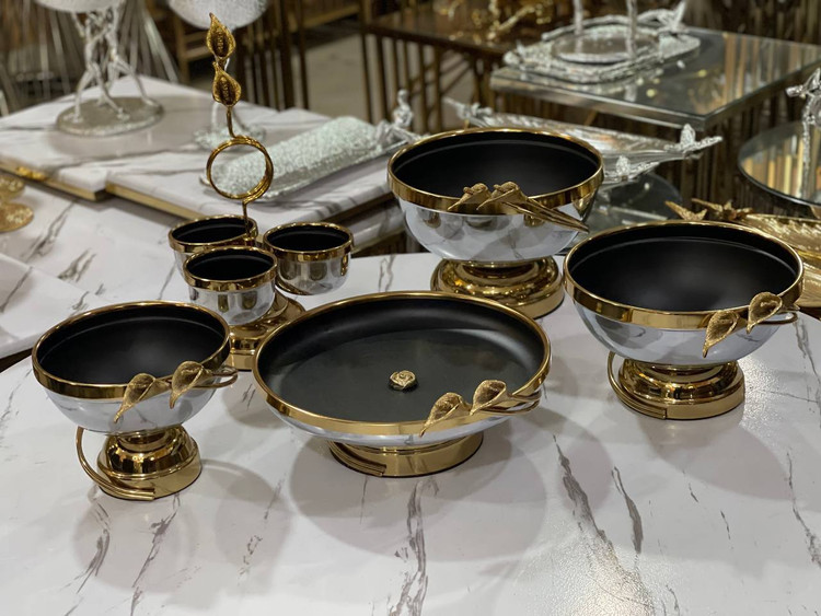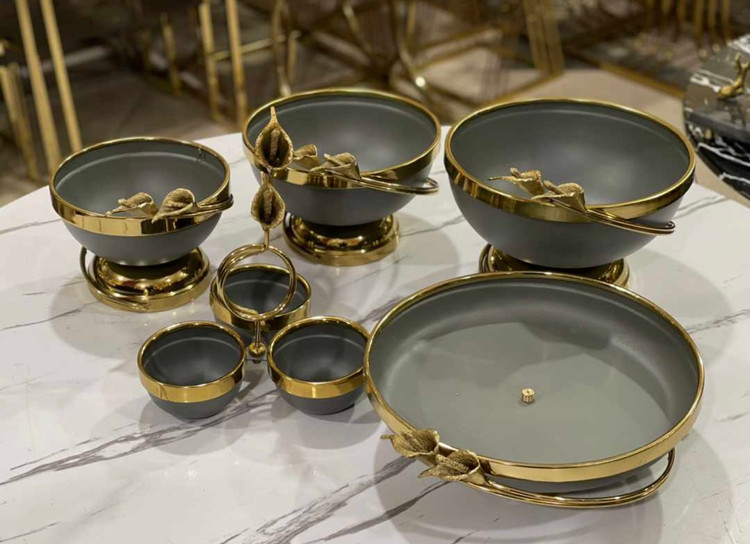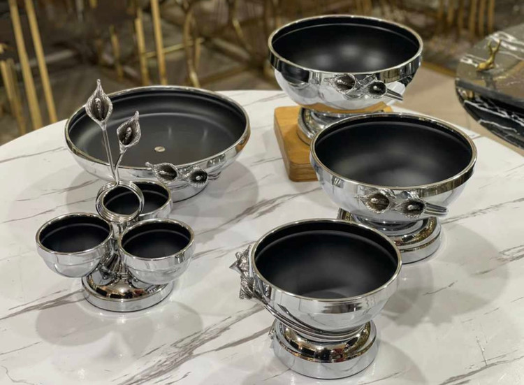 ظرف پذیرایی مدل “لیلیوم” با طراحی شکوهآمیز و مدرن خود میتواند هر فضایی را به سرزندگی درآورد. رنگ سیلور_طلایی به این ظروف ظاهری لوکس و براق میبخشند.