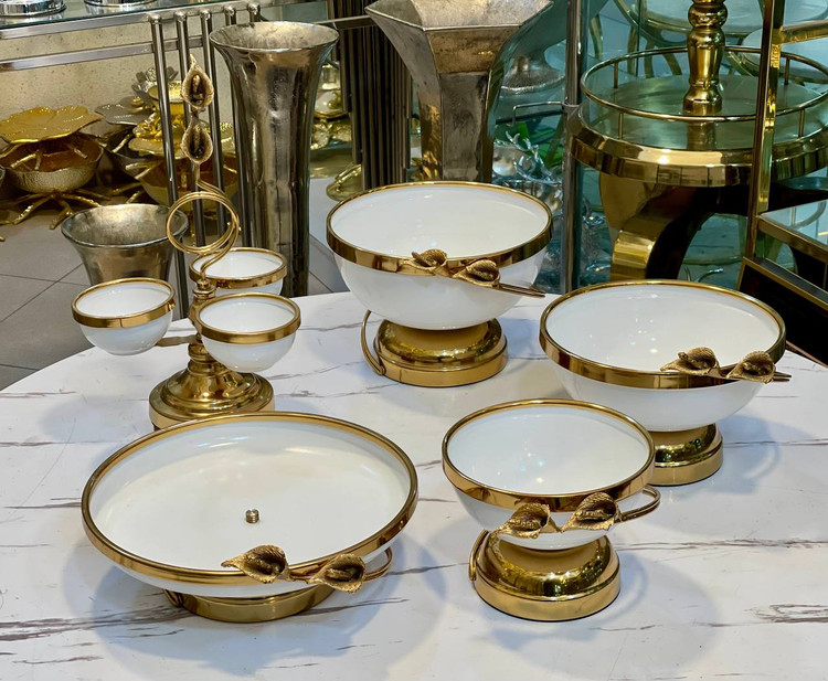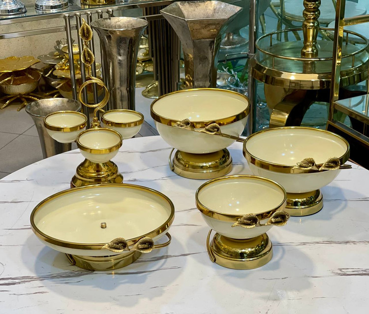 میوه خوری ارتفاع 20 قطر 26 سانت، شیرینی ارتفاع 15 قطر 30 سانت ، آجیل خوری ارتفاع 18 قطر 22 سانت و شکلات خوری ارتفاع 17 قطر 19 سانت است.